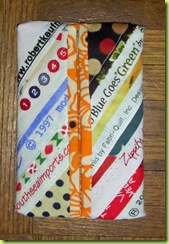 Isn’t it cute? She didn’t box the corners because of the bulk with all the seams. She used a used dryer sheet for the foundation and a great orange print for the lining. I really, really like it.